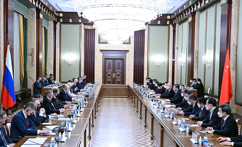 习近平指出,中俄是相互最大邻国,又是全面战略协作伙伴,保持中俄关系健康稳定发展,符合两国关系的历史逻辑和两国人民的根本利益。中国成功召开了中共二十大,前不久全国两会选举产生了新一届国家机构领导人,中国党、国家和人民空前团结,正在全面推进中国式现代化。中国新一届政府重视发展中俄全面战略协作伙伴关系,愿同俄方通过两国政府总理定期会晤等机制化交往渠道,推动实现两国合作新目标,取得更多新成果。